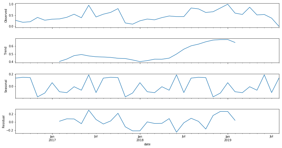 Observed, trend, seasonal, residual data analysis of monthly active pages SEO data