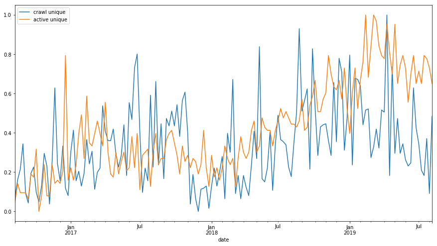 df_sum[['crawl unique', 'active unique']] = scaler.fit_transform(df_sum[['crawl unique', 'active unique']])