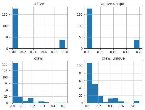 df_sum[['crawl','crawl unique','active','active unique']] = scaler.fit_transform(df_sum[['crawl','crawl unique','active','active unique']])